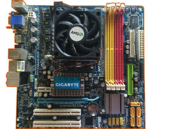 This is a motherboard. The RAM slots, at the right, are red and yellow. Find out how much memory your computer can handle.
